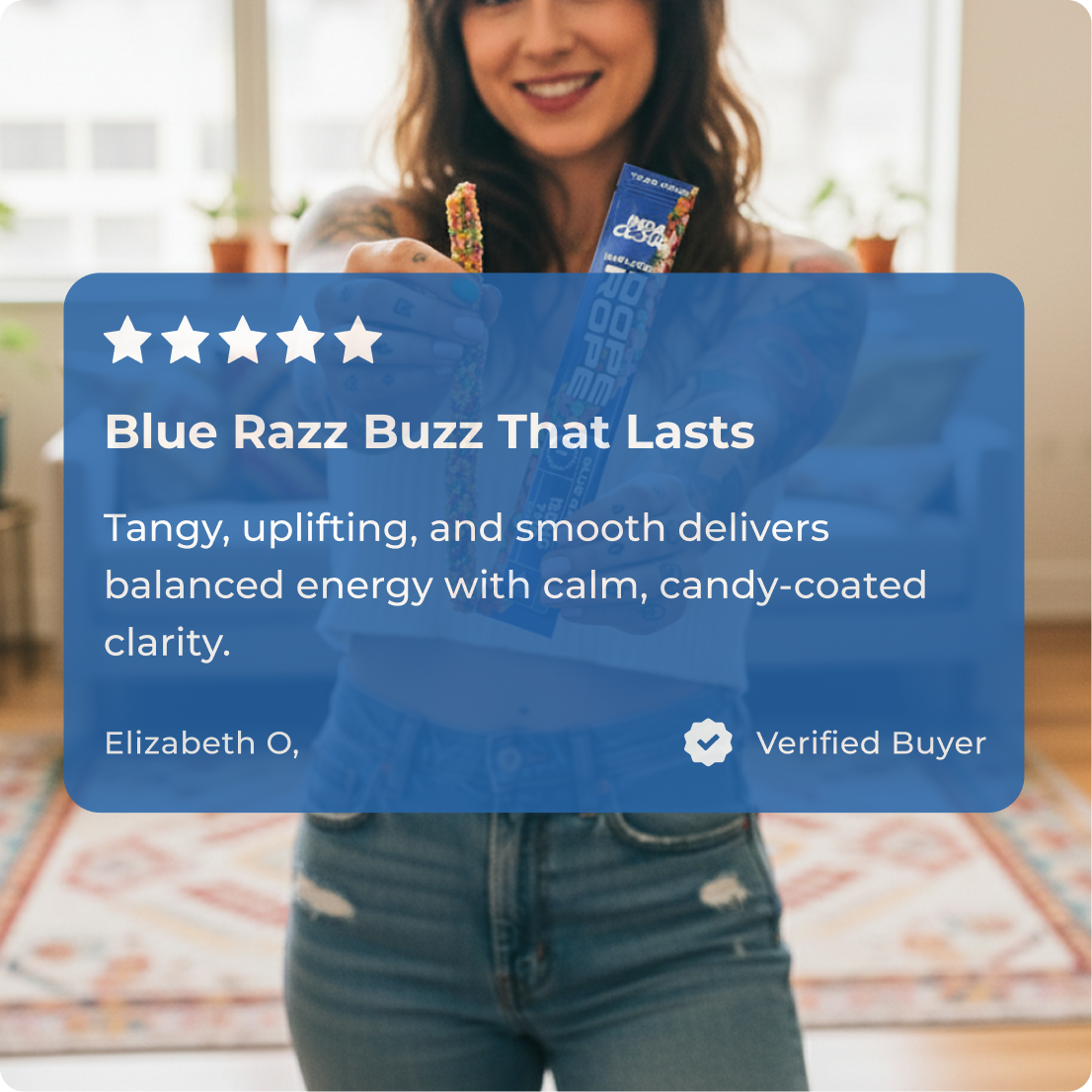 Candy-coated rope bursting with bombastic Blue Razz flavors, delivering smooth, full body relaxation and nostalgic joy.