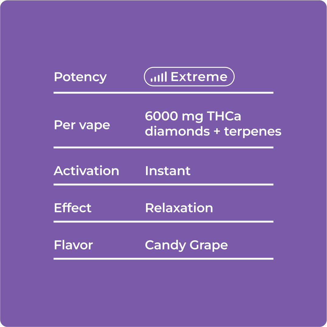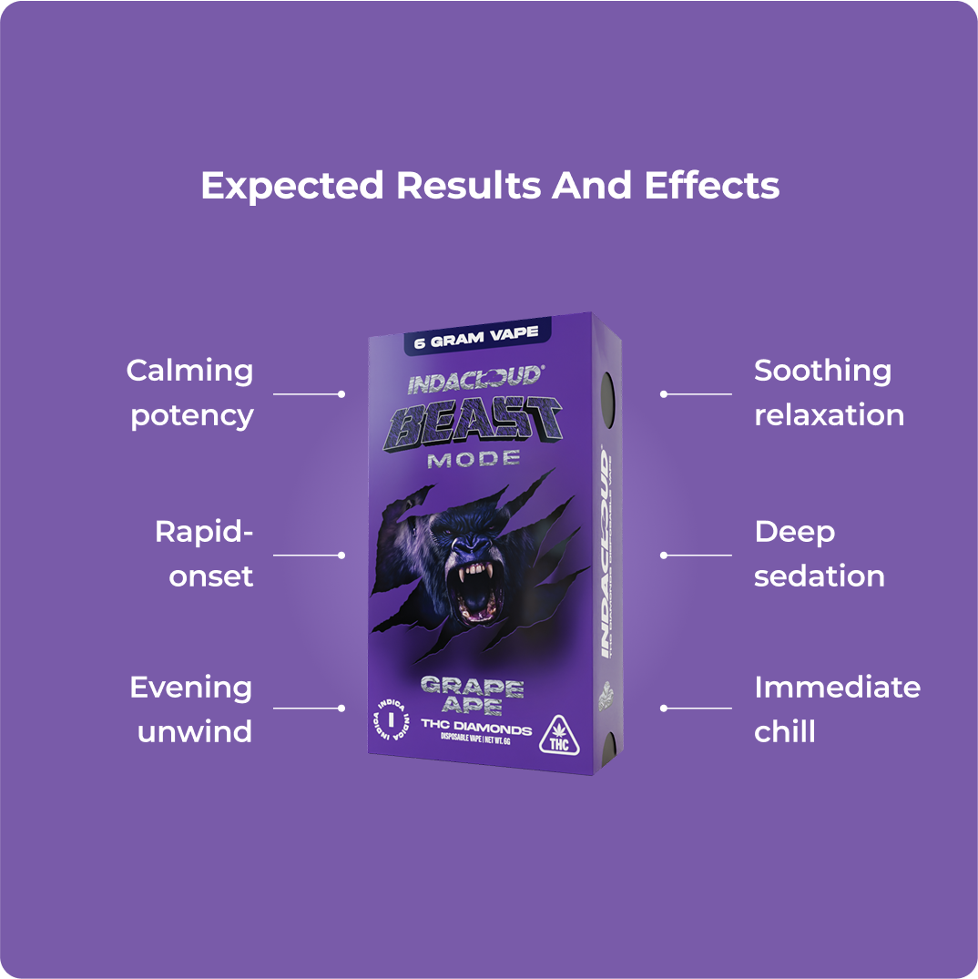 Triple-grape sweetness meets Beast Mode potency, Grape Ape delivers knockout relaxation, dreamy sedation, and smooth fruit flavor in a heavy-duty 6 g rechargeable vape.