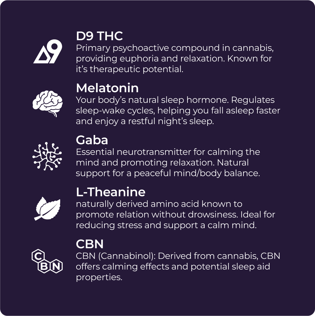 Soluble tapioca fiber, isomalt, water, pectin, citric acid, sorbitol powder, mtc oil, lecithin (from sunflower seeds) natural flavoring, natural color, melatonin, L-theanine, gamma-aminobutyric acid (GABA) hemp derived isomers.