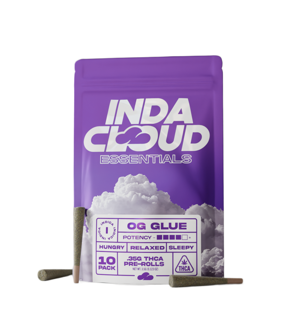 Pack of 10 expertly rolled pre-rolls of OG Glue, delivering heavy relaxation, stress relief, and full-body calm with earthy, pungent flavor.
