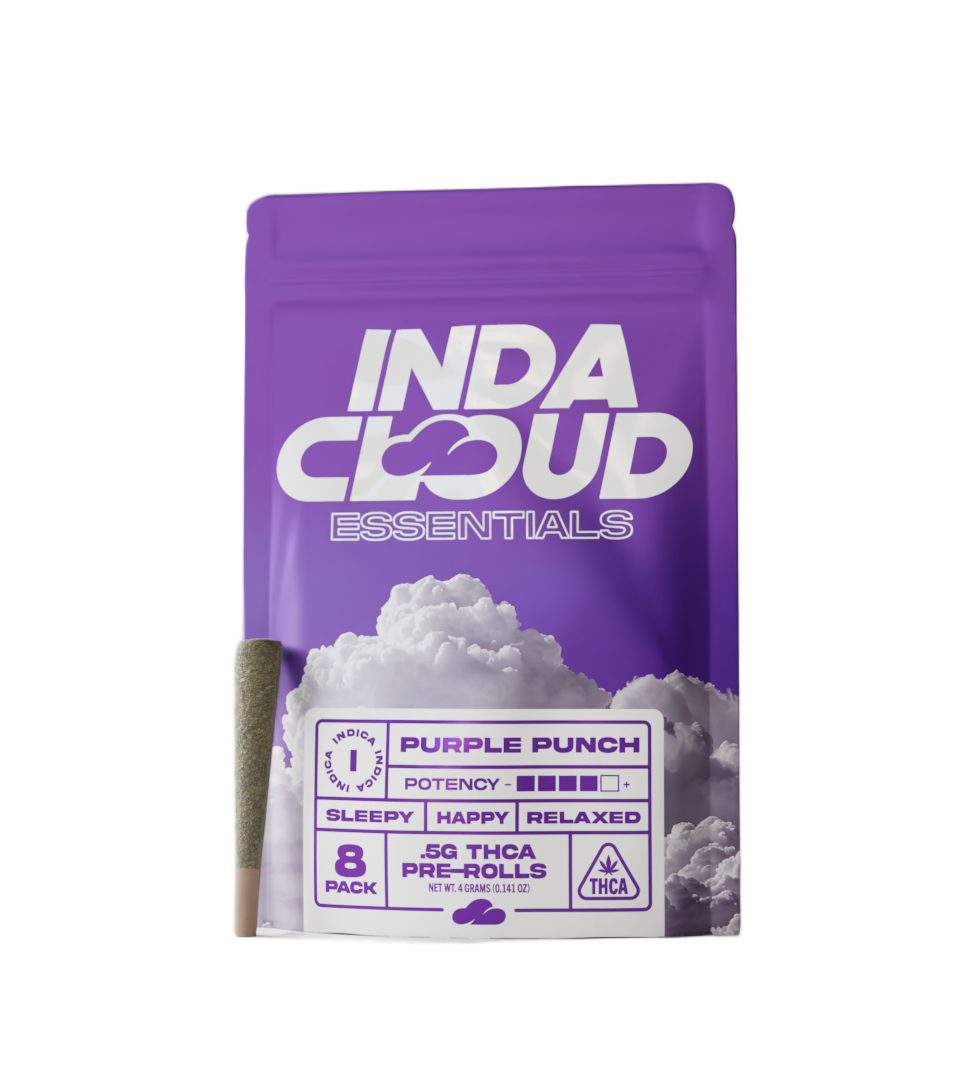 Pack of 8 premium pre-rolls of Purple Punch, capturing sweet berry flavors, soothing relaxation, and euphoric calm, perfect for unwinding or nighttime use.